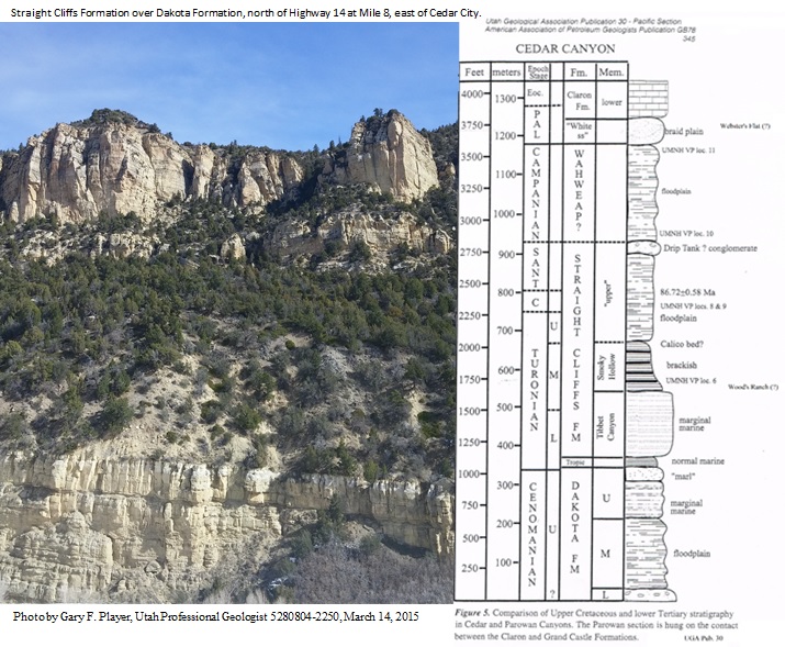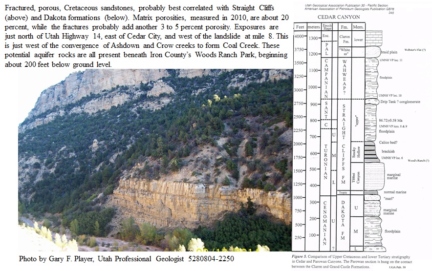 First well at Woods RanchThe porosity of the Cretaceous rocks is seen by the waterand ice which comes out of the rocks just above the former coal mine, and just below Woods Ranch. The saturation of these rocks is one reason for the regular landslides here. This acquifer can be tested with a well at Woods Ranch. Water from this well can be put in Coal Creek to get to Cedar Valley. Based on the successful well in the same formation at Brian Head, a Woods Ranch test is a next step. |